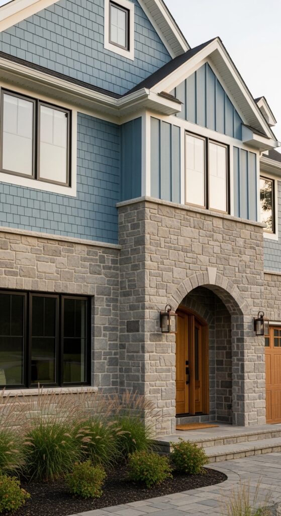 What makes it work: The contrast between cool denim blue siding and warm natural stone base creates a material conversation that gives the house genuine architectural depth. The stone base reads as load-bearing and permanent; the denim siding above reads as lighter and more contemporary — it’s a visual narrative about how the house is built.