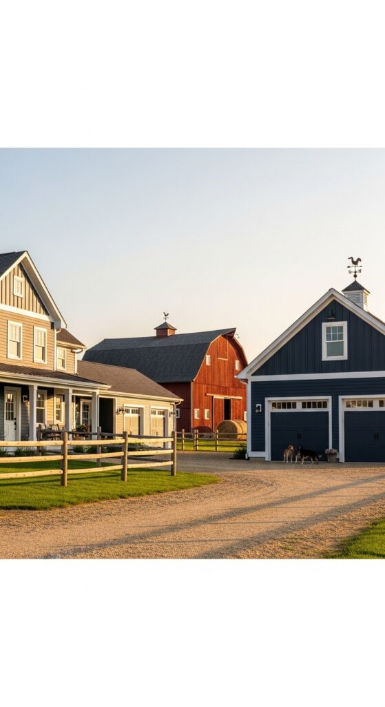 What makes it work: Coordinating outbuildings, garages, and farm structures in the same dark blue as the main house creates a unified, intentional property aesthetic that is rare and deeply satisfying. The traditional red barn provides a single accent color that pulls the whole composition together without requiring any additional complexity.