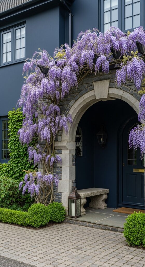 What makes it work: Purple wisteria cascading over a dark charcoal navy wall creates a color combination of extraordinary drama — the purple blooms appear almost luminous against the dark background, and the stone arch frames the entry like a stage. This is a house that transforms completely between seasons, and is spectacular in all of them.