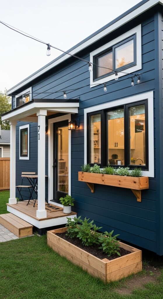 What makes it work: Dark navy on a small structure is counterintuitively successful — rather than shrinking an already small form, it gives the tiny home a density and presence that makes it look deliberate and intentional rather than merely compact. Black windows at this scale add graphic precision that elevates the entire composition.