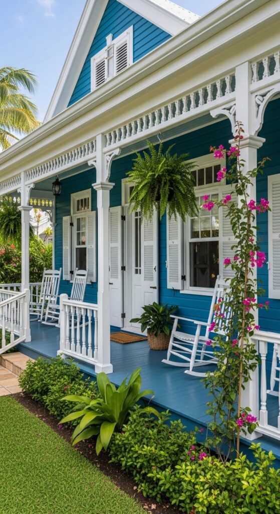 How to achieve it: Benjamin Moore “Bimini Blue” or Sherwin-Williams “Reflecting Pool” produce a beautiful blue-teal that references Caribbean tradition while reading as sophisticated rather than kitschy. Pair with pure white trim and at least one flowering climbing plant — bougainvillea or mandevilla — in a contrasting warm tone.