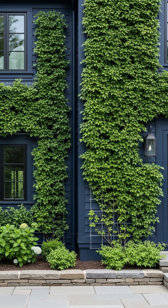 How to achieve it: Virginia creeper and climbing hydrangea are the most reliable self-adhering climbers for dark-painted surfaces. Install a galvanized wire trellis system to protect the paint surface and allow air circulation — this prevents moisture damage behind the plants and significantly extends the life of the exterior finish.