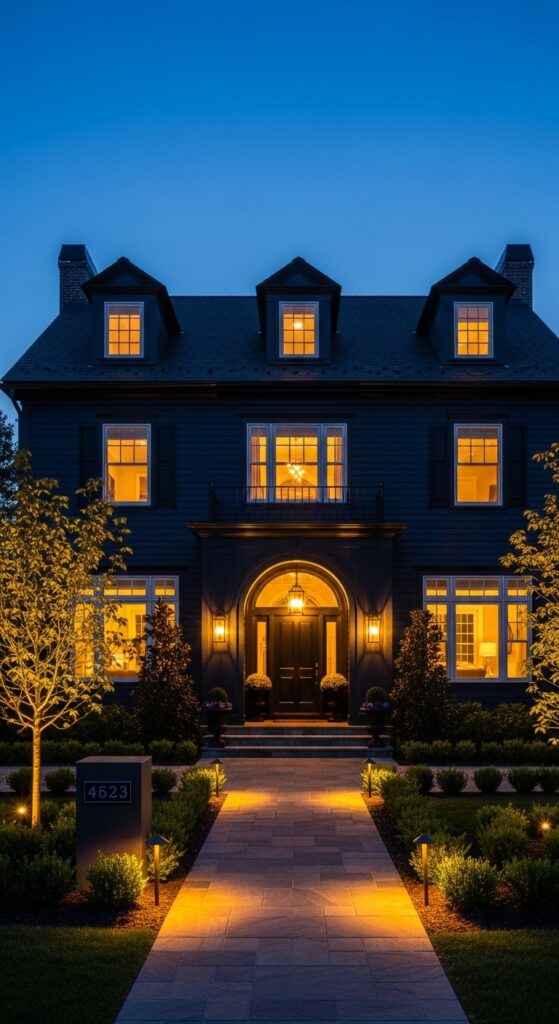 What makes it work: Dark exterior colors have a unique relationship with exterior lighting — where a white house reflects all available light at night, a navy house absorbs ambient light and only reveals itself where lighting is directed. This means well-placed uplighting creates far more dramatic results on a dark house than on a light one, turning the facade into a lit canvas.