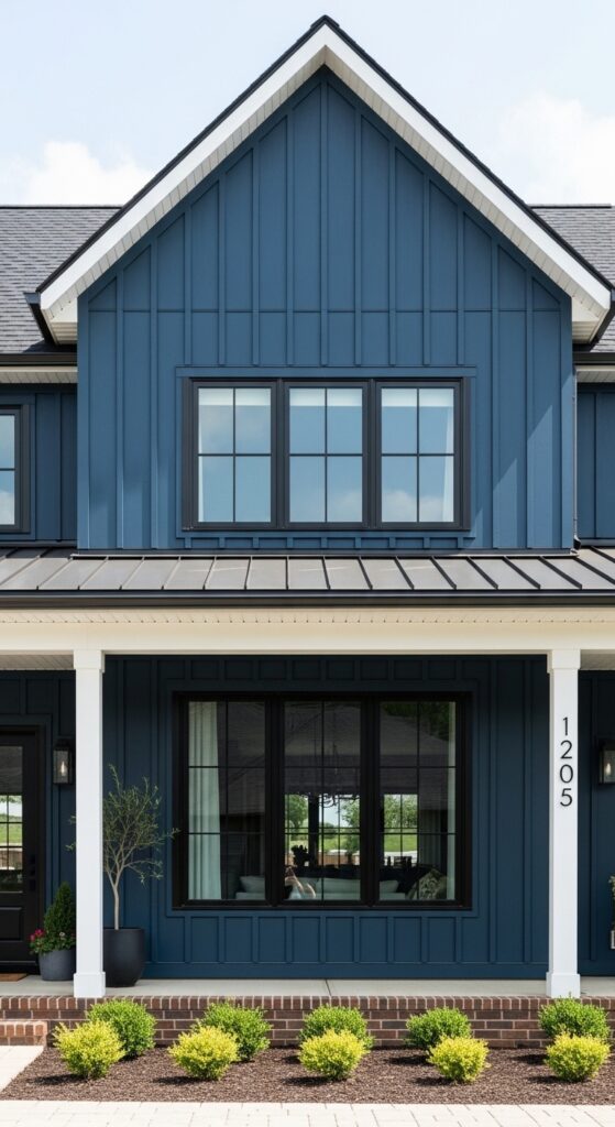 What makes it work: Midnight blue board and batten with black window frames is one of the most pinned exterior combinations on Pinterest precisely because it reads as both contemporary and rooted. The vertical lines of board and batten draw the eye upward, adding perceived height, while the black frames unify windows into a graphic, modern grid.