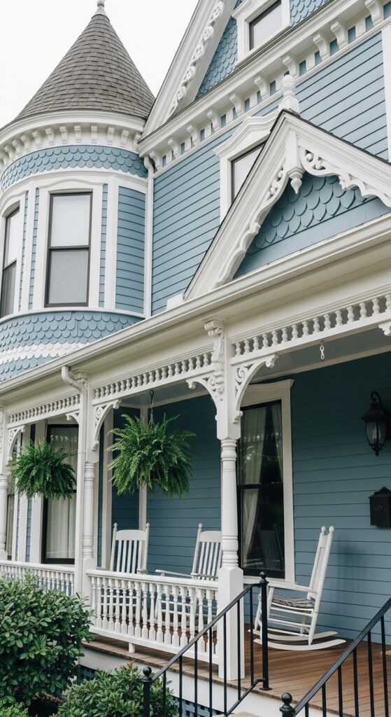 What makes it work: Slate blue — softer and slightly greyer than true navy — is perfect for Victorian homes because it doesn’t compete with the ornate white woodwork. The color recedes gently, allowing the gingerbread trim, brackets, and patterned shingles to read as the visual feature they’re meant to be.