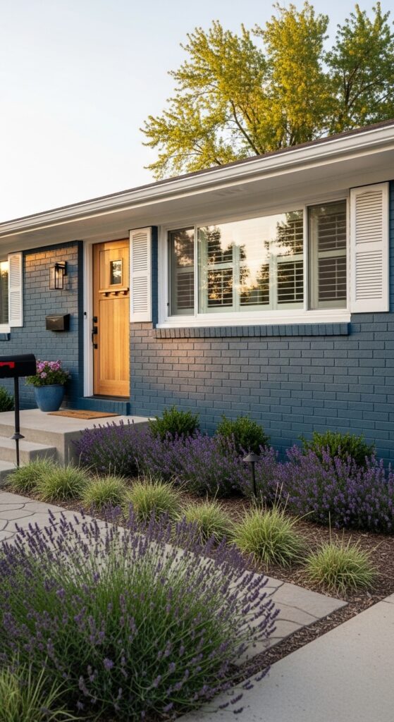 What makes it work: A dark denim blue on a low ranch profile prevents the horizontal form from disappearing into the landscape. White shutters frame each window emphatically, adding vertical accents that break up the long facade, while a natural wood door brings warmth that stops the combination from feeling too cool or corporate.