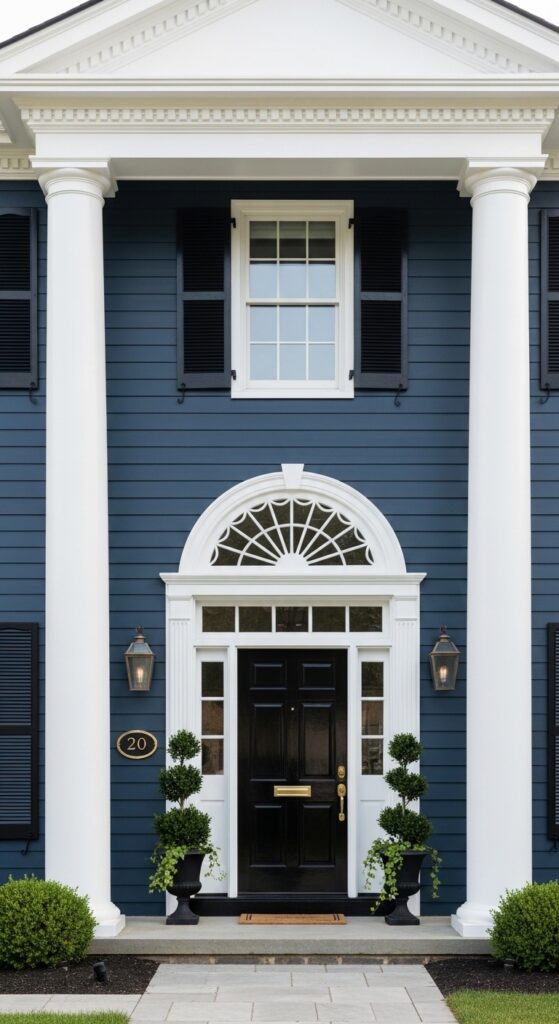 How to achieve it: Benjamin Moore “Hale Navy” or Sherwin-Williams “Naval” are the two most-cited navy exterior colors by designers — both read as deep, clean navy without veering purple or green. Pair with pure bright white trim (not cream) for maximum contrast, and choose a semi-gloss finish for door and trim to catch light.