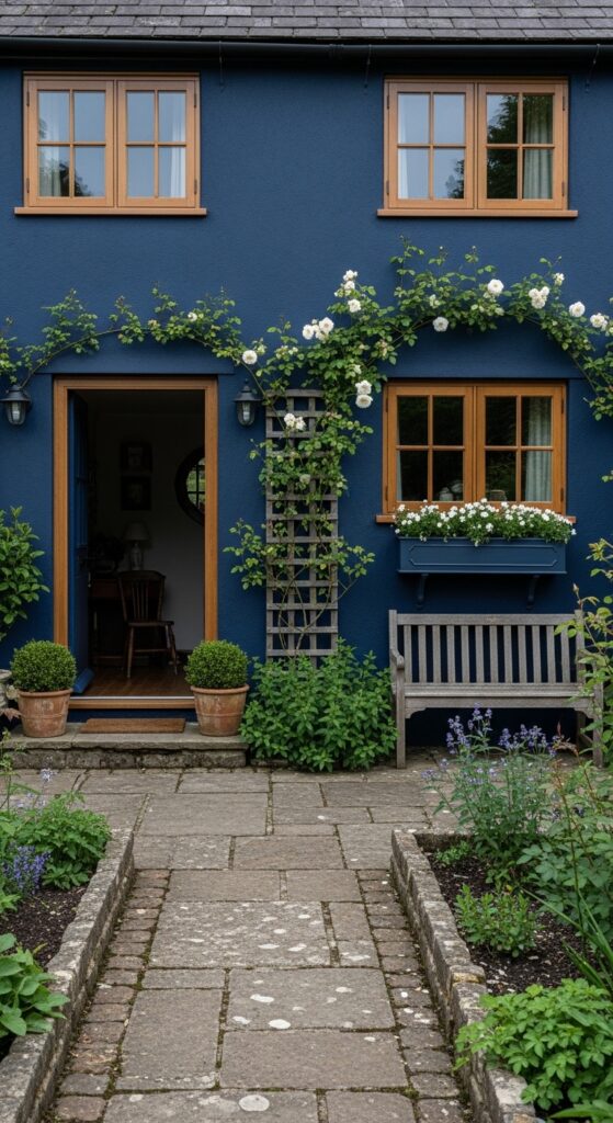 What makes it work: Indigo blue’s purple undertone creates an extraordinary contrast with white flowering plants — roses, wisteria, or white window box blooms all appear more luminous against the deep blue background than they would against any other color. The stone path and cottage planting complete a composition that feels centuries old.