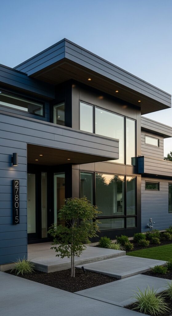 How to achieve it: Specify dark blue powder-coated metal panels or dark blue fiber cement cladding in a horizontal profile. James Hardie’s “Night Blue” or “Cobalt Blue” in the ColorPlus finish offers exceptional fade resistance and a clean, factory-applied color specifically formulated for long-term exterior performance.