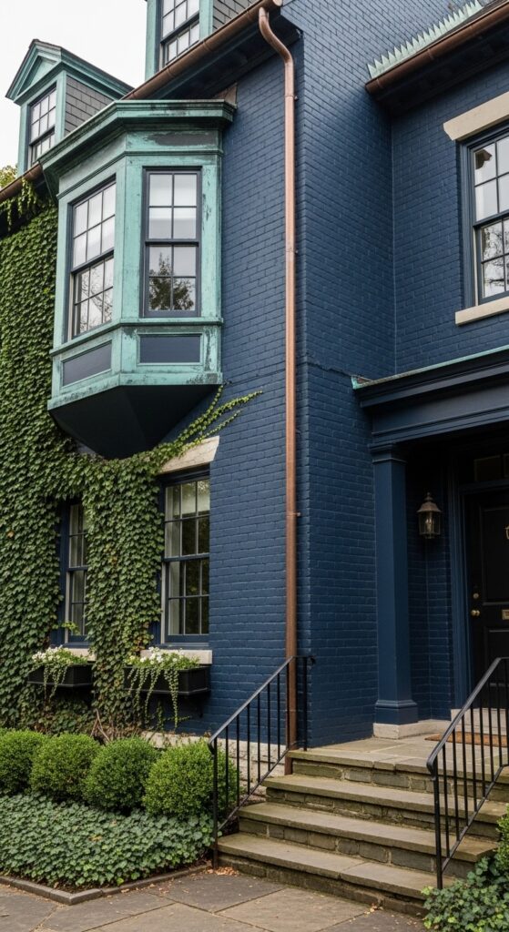 8. Navy Blue Brick House with Ivy and Aged Copper Details