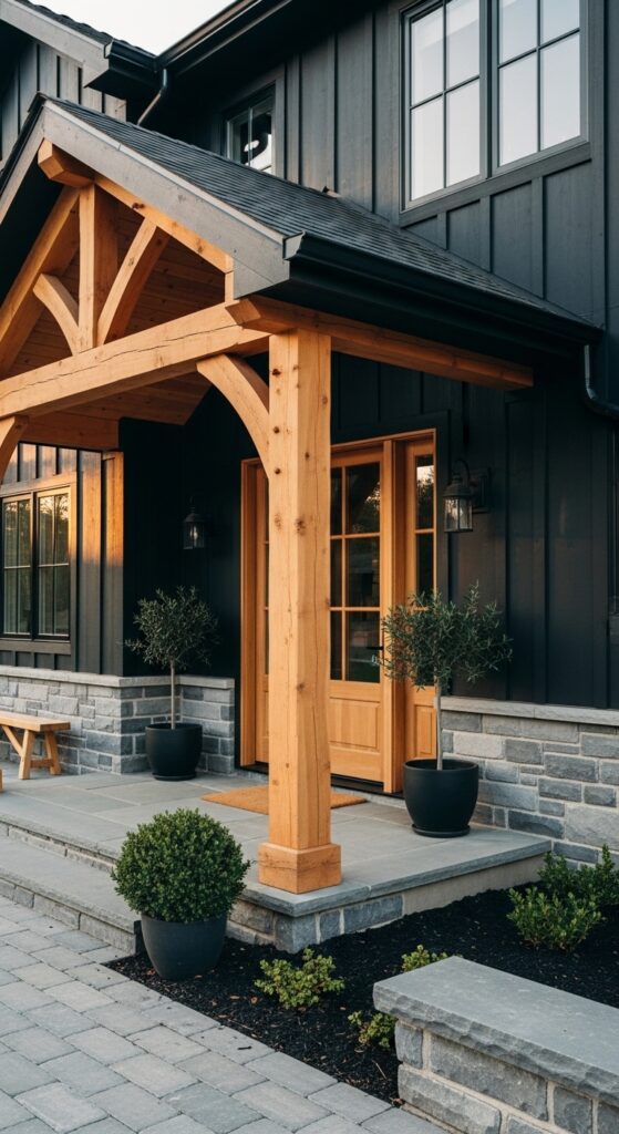 What makes it work: Blue-black — a color with just enough blue to distinguish it from true black — creates extraordinary contrast against warm natural timber. The stone foundation grounds the house in materiality, while the timber porch frame creates a zone of warmth that softens an otherwise dramatically dark exterior.