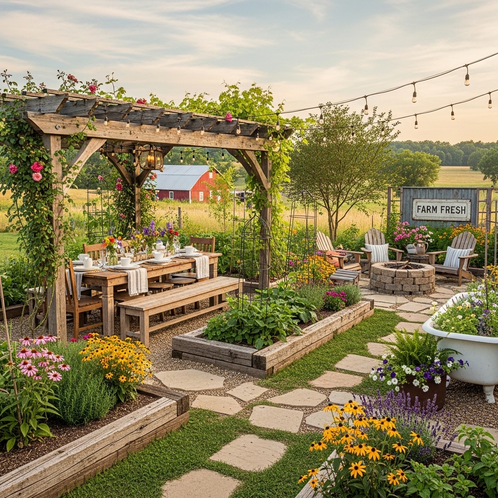 That’s what the farmhouse backyard aesthetic does. It takes natural materials — wood, stone, metal, botanical life — and arranges them with intention and warmth. It’s not about perfection. It’s about character. Weathered timber has more soul than pristine composite decking. A galvanized trough overflowing with lily pads tells a better story than a store-bought fountain. An old clawfoot tub spilling over with petunias is a conversation piece that a ceramic planter simply cannot be.