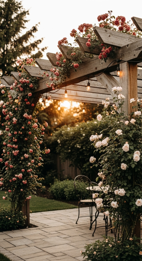 A pergola built from weathered reclaimed timber draped in cascading climbing roses is the farmhouse backyard centerpiece that dreams are made of. Choose blush or deep red David Austin roses for maximum romance. Style tip: hang Edison bulb string lights along the beams for evenings that never want to end. Perfect for romantic garden lovers and cottagecore enthusiasts who want a statement structure.