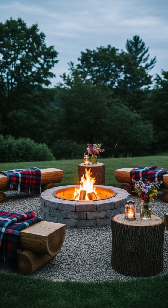 A stone-rimmed firepit at the heart of a circle of hewn log seats wrapped in plaid wool blankets is the outdoor gathering space that calls everyone in. Use river rocks or stacked limestone for the pit wall. Style tip: scatter lanterns between the log seats and tuck wildflowers into mason jar arrangements on a small side stump. Perfect for families and social entertainers who live for long evenings under the stars.