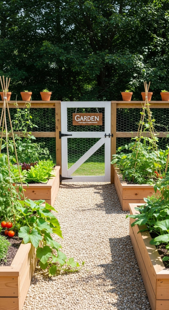 Rows of cedar raised garden beds filled with heirloom tomatoes, leafy herbs, and trailing squash vines, enclosed by charming chicken wire fencing with a swinging gate, feel like a storybook kitchen garden. Paint the gate post white for contrast. Style tip: add a small handpainted wooden sign. Ideal for homesteaders, gardening enthusiasts, and families who want beauty and function growing side by side.