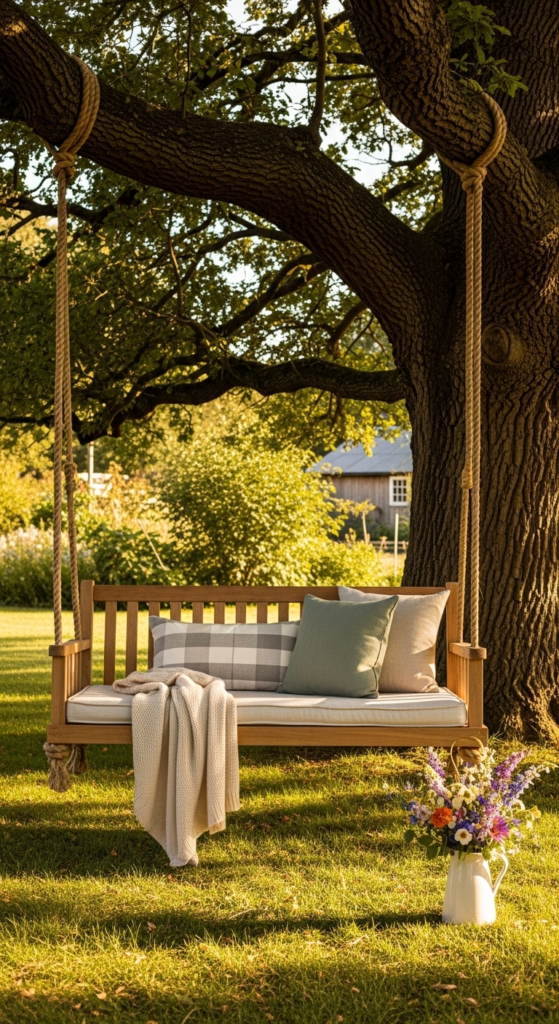 Nothing captures the soul of a farmhouse backyard more completely than a wide wooden plank swing suspended from a towering old oak on thick manila rope. Dress it with a linen cushion in ticking stripe and a knit throw. Style tip: place a wildflower arrangement in a jug beneath it. This is pure childhood nostalgia translated into grown-up elegance. Perfect for families and romantics alike.