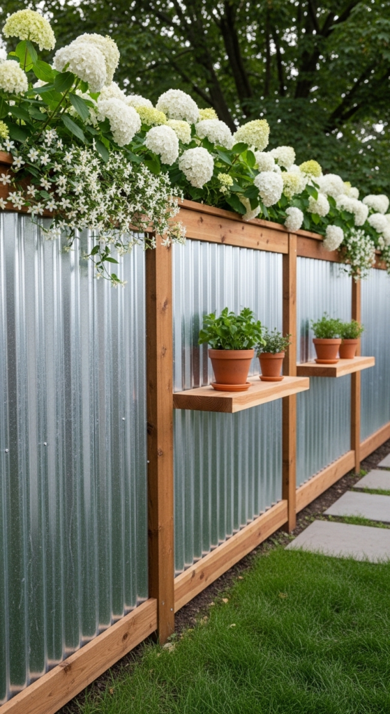 The combination of corrugated galvanized metal panels set within a cedar frame creates a fence that is modern farmhouse perfection — industrial texture softened by warm wood. Train climbing hydrangeas or jasmine along the top edge for a softening floral finish. Style tip: mount small cedar floating shelves along the fence for potted herbs. Ideal for suburban backyards wanting privacy without sacrificing style.
