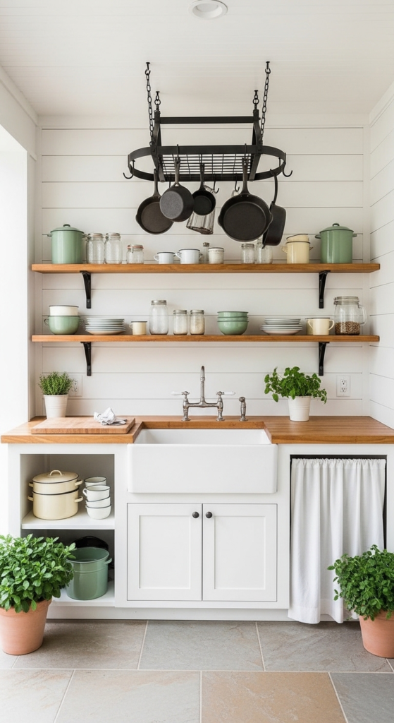 An outdoor kitchen built with shiplap siding, open shelving displaying vintage enamelware, a deep farmhouse sink, and a butcher block counter under a covered porch overhang is the ultimate al fresco entertaining dream. Hang cast iron pots on a ceiling rack. Style tip: keep a jar of fresh garden herbs on the counter. Perfect for passionate home cooks and families who believe the best meals are made — and eaten — outside.
