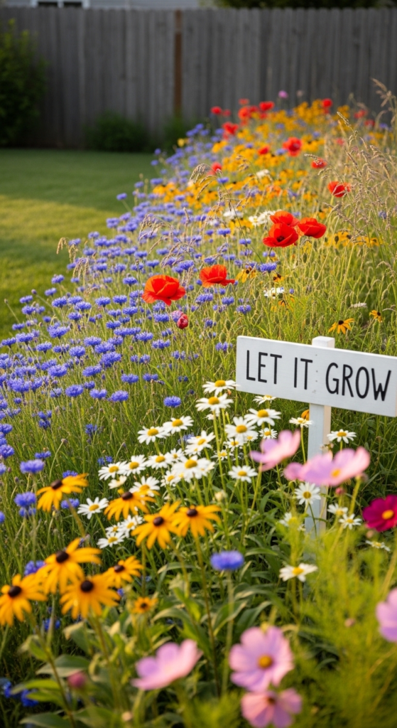 Replace a conventional garden border with a sweeping wildflower meadow planting — cornflowers, poppies, black-eyed Susans, ox-eye daisies, and cosmos swaying in casual, unscripted abundance. The look is effortlessly beautiful and wildly pollinator-friendly. Style tip: add a simple painted wooden garden sign that reads ‘Let It Grow.’ Perfect for eco-conscious gardeners, countryside home lovers, and anyone who finds perfection in beautiful imperfection.