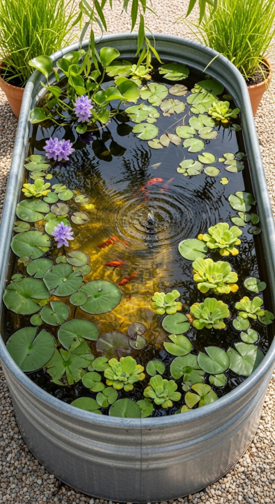 A repurposed galvanized metal livestock trough transformed into a still-water garden pond — floating lily pads, a few water hyacinths, and the occasional glimpse of goldfish — is one of those unexpectedly magical farmhouse garden features. Position it beneath a weeping willow or near a fence draped in roses. Style tip: add a small solar-powered fountain pump for gentle sound. Ideal for peaceful garden retreats and water garden lovers.
