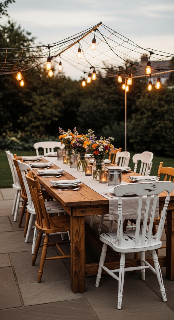 A massive reclaimed barn wood dining table positioned on a stone patio beneath a canopy of warm Edison string lights is outdoor entertaining done with soul. Mismatched farmhouse chairs in distressed white and natural wood surround it. Style tip: set the table with linen runners, wildflower jugs, and tin candle holders for a casual yet beautiful aesthetic. Perfect for large family gatherings and lovers of outdoor dinner parties.