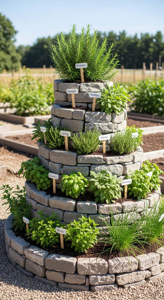A stone-built herb spiral — a tiered coiling structure that rises from a base of mint and chives to a sun-drenched peak of rosemary and thyme — is both a functional herb garden and a striking sculptural garden feature. Lay it with fieldstone or flat limestone. Style tip: tuck small handwritten herb marker sticks into each planting pocket. Perfect for kitchen gardeners, homesteaders, and anyone who wants beauty and practicality spiraling together.