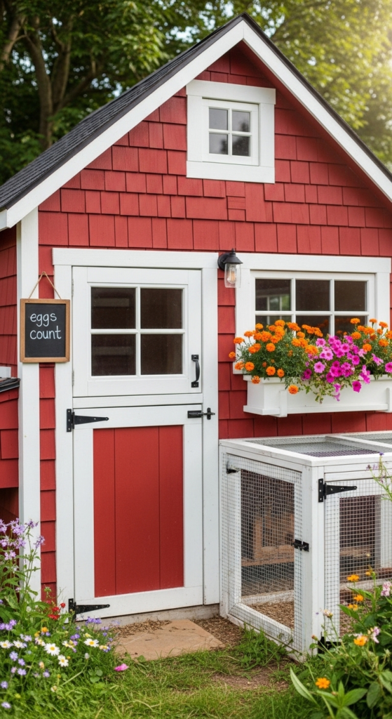 A well-designed chicken coop with clapboard siding, a painted Dutch door, and window boxes overflowing with cheerful marigolds and petunias is so charming it barely looks functional — but it is. Paint it in classic barn red or creamy white. Style tip: hang a small chalkboard beside the door for egg counts. Perfect for backyard homesteaders, urban farmers, and families who want their chickens to live as stylishly as they do.