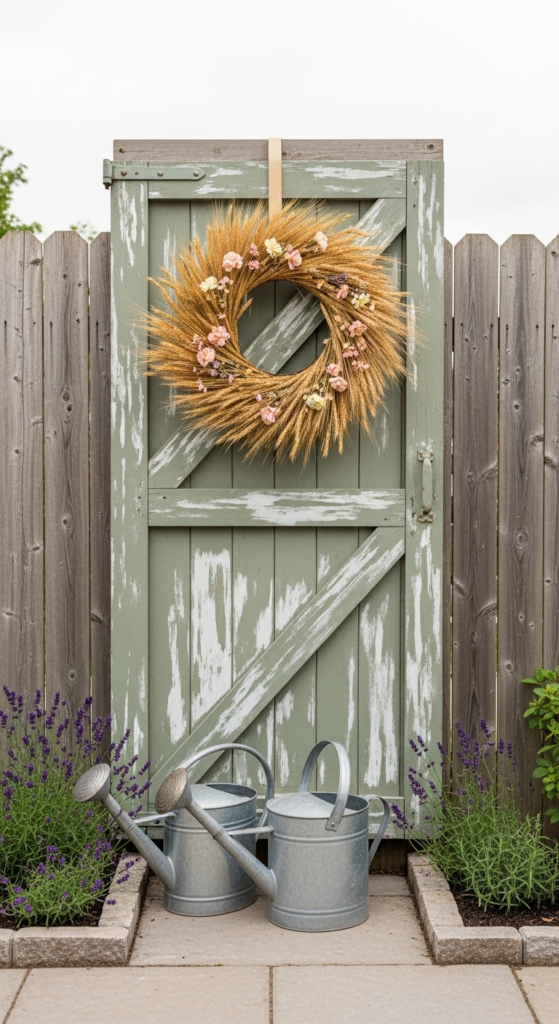An old full-size barn door mounted vertically on an exterior fence or outbuilding wall, painted in muted sage or chalky white, hung with a wreath of dried wheat and summer flowers, becomes an extraordinary piece of outdoor art. It’s the kind of statement that makes people stop and reach for their phone camera. Style tip: lean vintage galvanized watering cans at its base. Ideal for those who treat their backyard like an outdoor gallery.