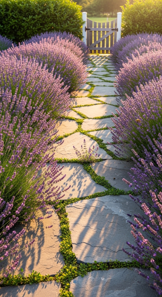 A gently curving path of irregular flagstones winding through rows of heavily planted English lavender on both sides is one of the most sensory experiences a garden can offer. The purple haze, the fragrance, the hum of bees — it’s a full-body arrival. Style tip: plant catmint between the stones for a purple-blue ground cover. Perfect for cottage garden lovers, lavender farm dreamers, and those building their forever home garden.