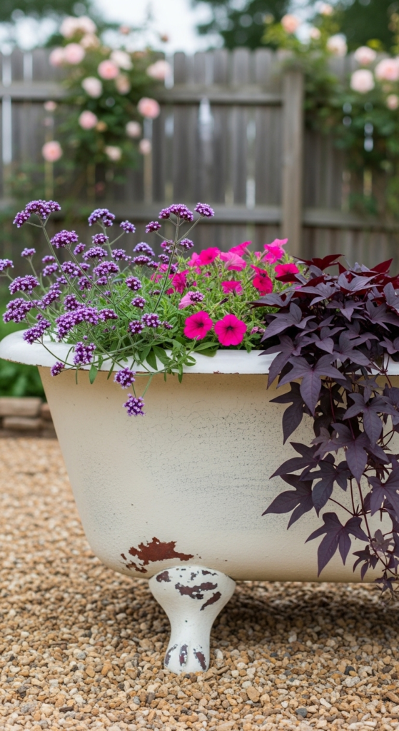 A repurposed cast iron clawfoot bathtub painted in chalky cream or dusky sage, overflowing with a riot of trailing verbena, petunias, and sweet potato vine, is the most unexpected and utterly brilliant farmhouse garden planter you can imagine. It has personality, history, and maximum visual impact. Style tip: distress the paint edges for authenticity. Perfect for maximalist garden decorators and those who see potential beauty in everything old.