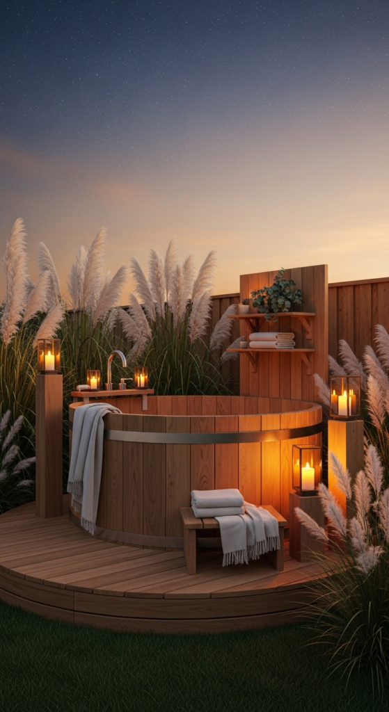 A cedar wood hot tub or soaking barrel nestled into a raised deck platform surrounded by tall ornamental grasses, glowing candle lanterns on wooden posts, and a view of the open night sky is luxury farmhouse living at its absolute finest. Style tip: hang a small cedar shelf nearby for towels, eucalyptus, and a glass of wine. This is the backyard feature that makes you never want to leave home. Perfect for wellness-minded homeowners.