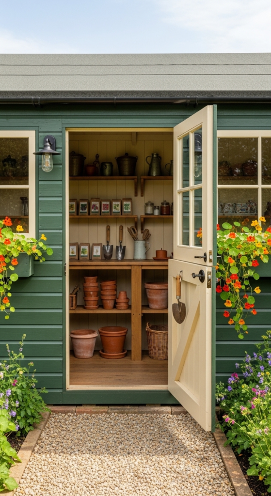 A small timber potting shed with board-and-batten siding, a Dutch door propped open to reveal organized shelves of terracotta pots, seed packets, and garden tools, with window boxes of trailing nasturtiums outside, is the garden room of every plant lover’s dreams. Paint it in forest green or deep navy. Style tip: hang dried herbs in bunches from the ceiling inside. Perfect for serious gardeners and cottagecore devotees.