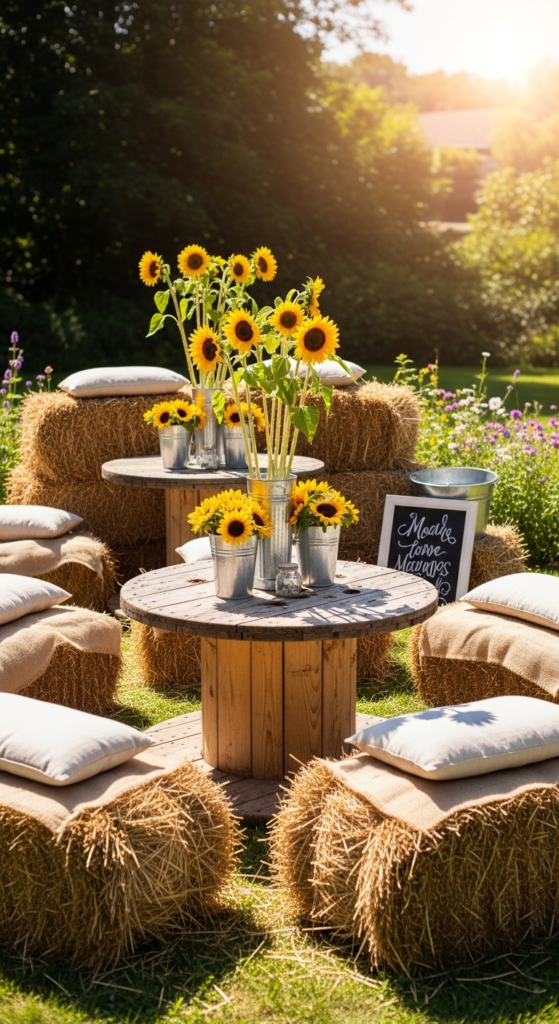 Hay bales wrapped in burlap and topped with simple linen seat cushions, arranged around a central wooden spool table crowned with tall sunflower arrangements in galvanized buckets, create the most effortlessly joyful outdoor seating area imaginable. This is pure summer joy. Style tip: add a hand-lettered chalkboard sign for an event or wedding. Perfect for outdoor parties, harvest festivals, summer celebrations, and those who believe joy is the best design principle.