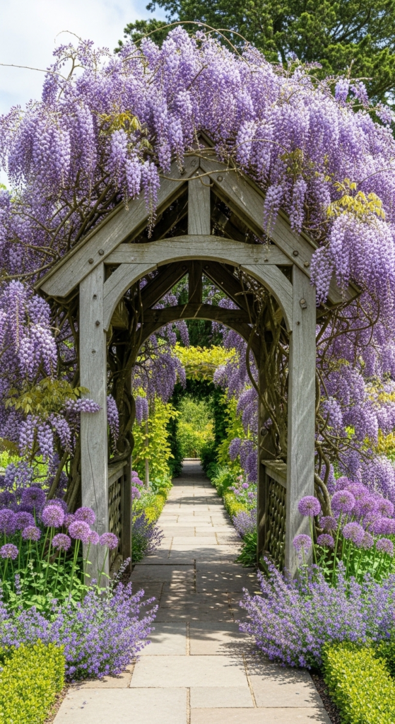 A substantial garden arch built from weathered wood timber, completely colonized by cascading purple wisteria in full spring bloom, framing the entrance to a garden pathway, is one of the most visually intoxicating structures in the farmhouse garden vocabulary. The purple against the silver-grey of aged wood is achingly beautiful. Style tip: underplant with alliums and nepeta at the base. Perfect for spring gardens, romantic garden designers, and wisteria obsessives.