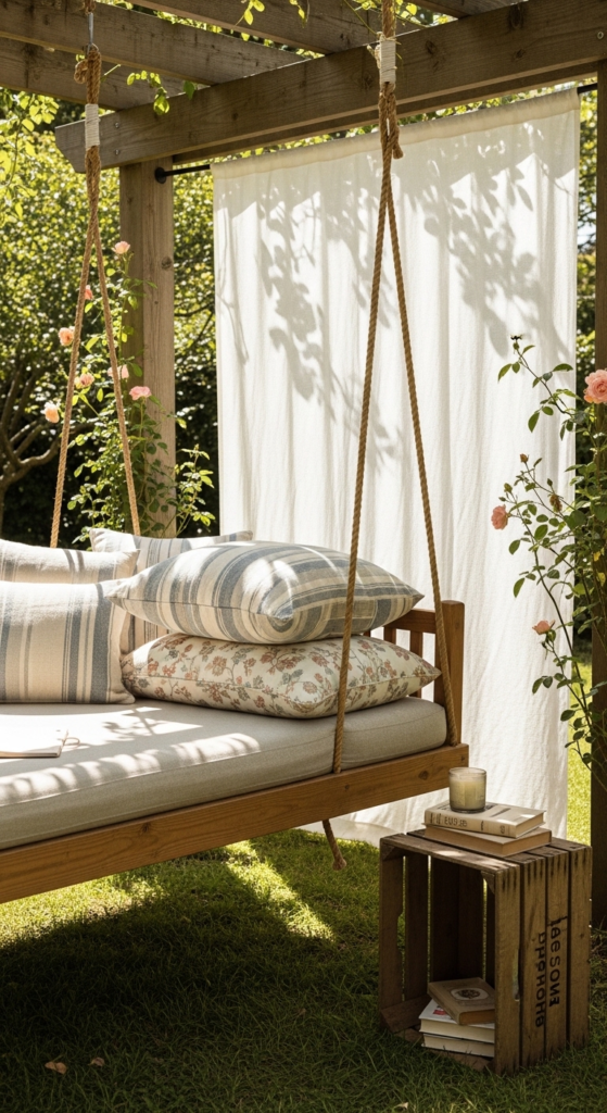 Tucked under a pergola or between two mature trees, a hanging swing daybed with a thick weatherproof linen cushion, stacked with outdoor pillows in faded stripes and florals, a small crate side table with a candle and a stack of books — this is the backyard nook that makes you want to cancel every plan and disappear into an afternoon. Style tip: hang a light gauze curtain for privacy. Perfect for introverts, book lovers, and anyone who needs a restorative outdoor escape.