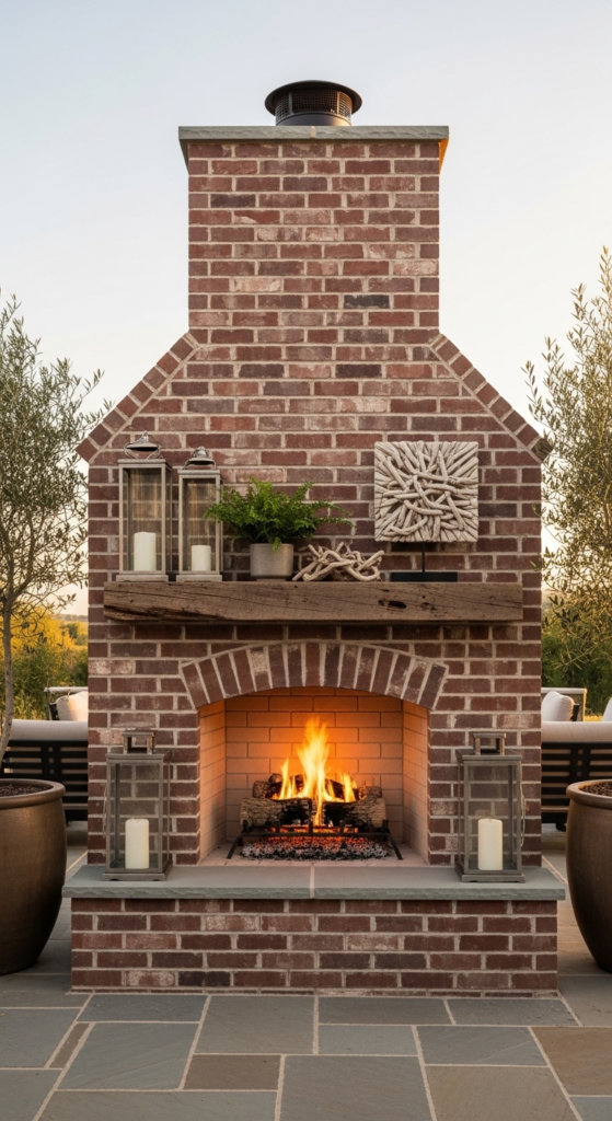 A freestanding outdoor fireplace built in brick with a reclaimed wood mantel shelf — styled with hurricane lanterns, a small potted fern, and a driftwood decorative piece — anchors a patio the way a great fireplace anchors a living room. It’s outdoor architecture. Style tip: flank it with two olive trees in terracotta pots. This is the investment backyard feature that makes the whole space feel complete. Perfect for serious outdoor living enthusiasts.