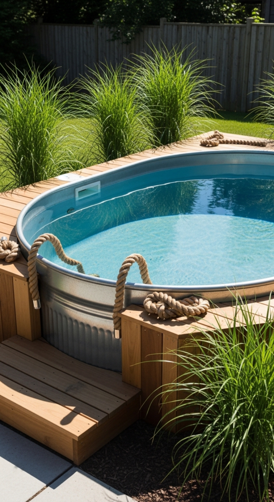 A large galvanized steel stock tank — the kind originally made for livestock — repurposed as a backyard plunge pool surrounded by a simple cedar deck, with rope handles on the sides and a portable wooden step, is pure farmhouse genius. Cool, functional, and endlessly photographable. Style tip: add an exterior-safe pump filter and plant tall grasses around the deck edge. Perfect for hot climate homeowners and small backyard maximizers.