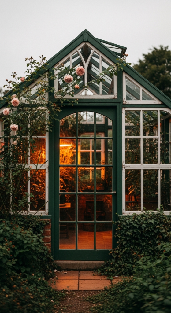 A small Gothic-arch greenhouse constructed from old window panes in mismatched sizes and weathered wood framing, surrounded by overgrown roses and climbing vines, looks like it was lifted directly from an English walled garden painting. Inside: seedling trays, hanging baskets, and the warm glow of grow lights. Style tip: paint the exterior frame in deep hunter green. Perfect for passionate gardeners, plant collectors, and those building their most beautiful life one plant at a time.