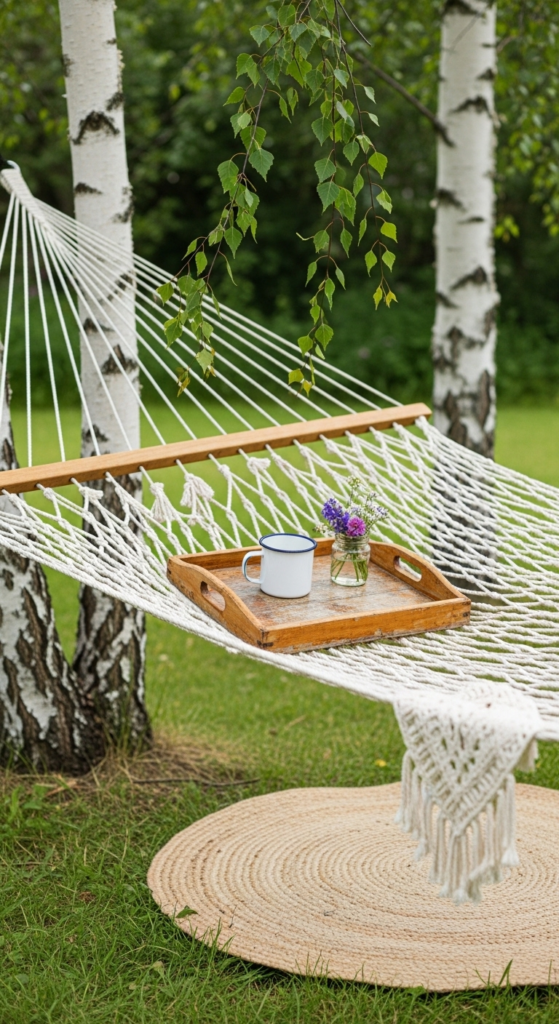 A hand-woven cotton rope hammock strung between two white-barked birch trees, with a worn wooden side tray balanced on the edge holding an enamel mug and wildflowers in a small jar, is the most inviting rest spot in any farmhouse backyard. The white bark of the birch against green lawn is naturally stunning. Style tip: place a round jute rug beneath the hammock. Perfect for slow living enthusiasts and backyard relaxation devotees.