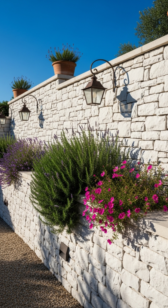 A terraced garden level retained by a whitewashed dry stone wall, planted along the top with trailing rosemary, lavender, and rock roses spilling down the face, creates a Mediterranean farmhouse garden scene of breathtaking beauty. The white of the stone against a deep blue sky is visually unforgettable. Style tip: mount iron wall sconces along the wall for evening lighting. Perfect for sloped gardens, Mediterranean climate zones, and warm-weather outdoor living lovers.
