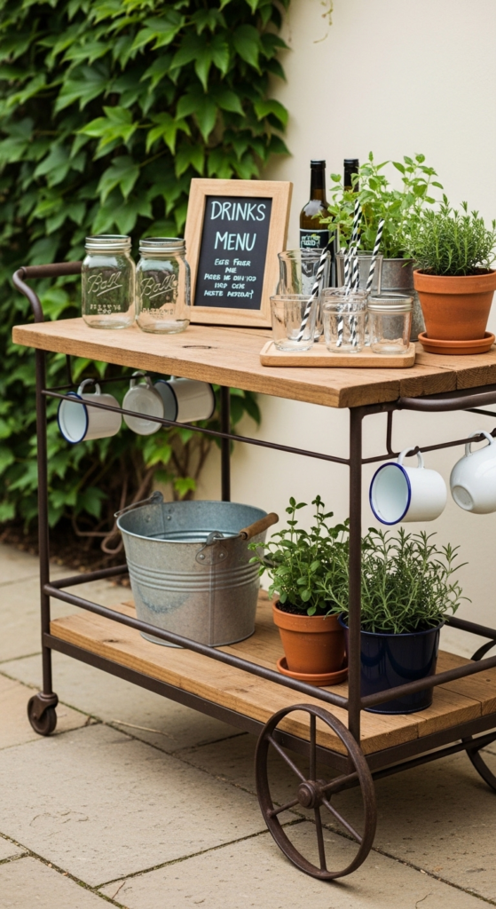 A repurposed antique trolley or iron pipe frame fitted with a reclaimed wood top, stocked with mason jar glasses, a vintage ice bucket, potted herbs, and hanging enamel cups, becomes an outdoor bar that looks like it has decades of stories. Position it beside the patio seating. Style tip: mount a small chalkboard for the drink menu. Perfect for home entertainers, cocktail lovers, and anyone who believes the bar cart is the most important piece of outdoor furniture they will ever own.