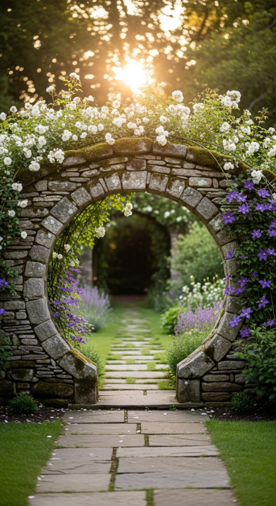 A circular moongate arch — built from moss-covered stone or whitewashed brick — framing the entrance to the garden creates the most poetic, portal-like garden feature in the farmhouse outdoor design canon. Frame it with climbing roses, clematis, or jasmine for a floral crown effect. Style tip: light it with uplighting at night for pure drama. Perfect for garden designers, romantic souls, and those building a backyard that tells a story from the very first step through the gate.