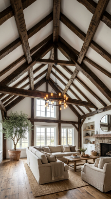 Dark hand-hewn timber beams soaring overhead give any farmhouse living room instant soul.