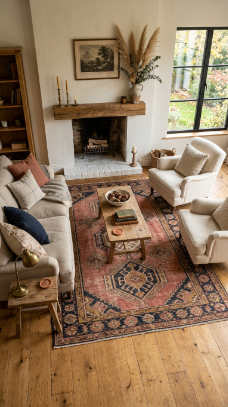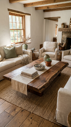 The farmhouse living room is where everything slows down. It’s the worn leather sofa you sink into, the crackling fireplace you never want to leave, the linen curtains that catch the morning light just right. It’s comfort made beautiful and beauty made comfortable.