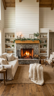 Floor-to-ceiling white shiplap behind a stone fireplace is timeless farmhouse perfection.