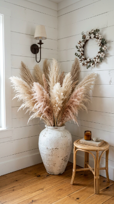 A tall ceramic vase overflowing with dried pampas grass makes effortless organic farmhouse art.