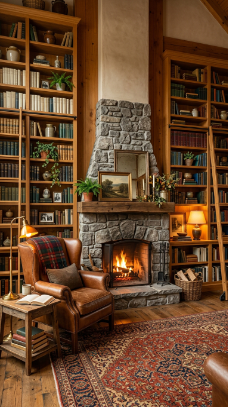 Floor-to-ceiling bookshelves flanking the fireplace in rich amber wood are deeply inviting.
