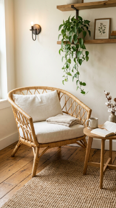 One beautiful woven rattan armchair in the corner instantly adds warmth and organic texture.