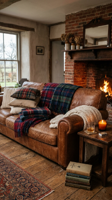 A worn, lived-in leather sofa piled with plaid wool throws is the coziest farmhouse combination.