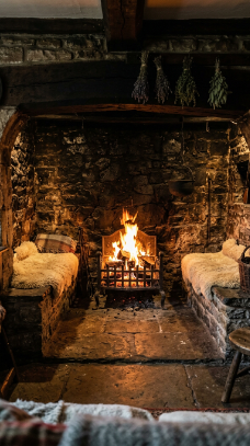 A deep inglenook fireplace with built-in stone seating benches is the ultimate farmhouse retreat.